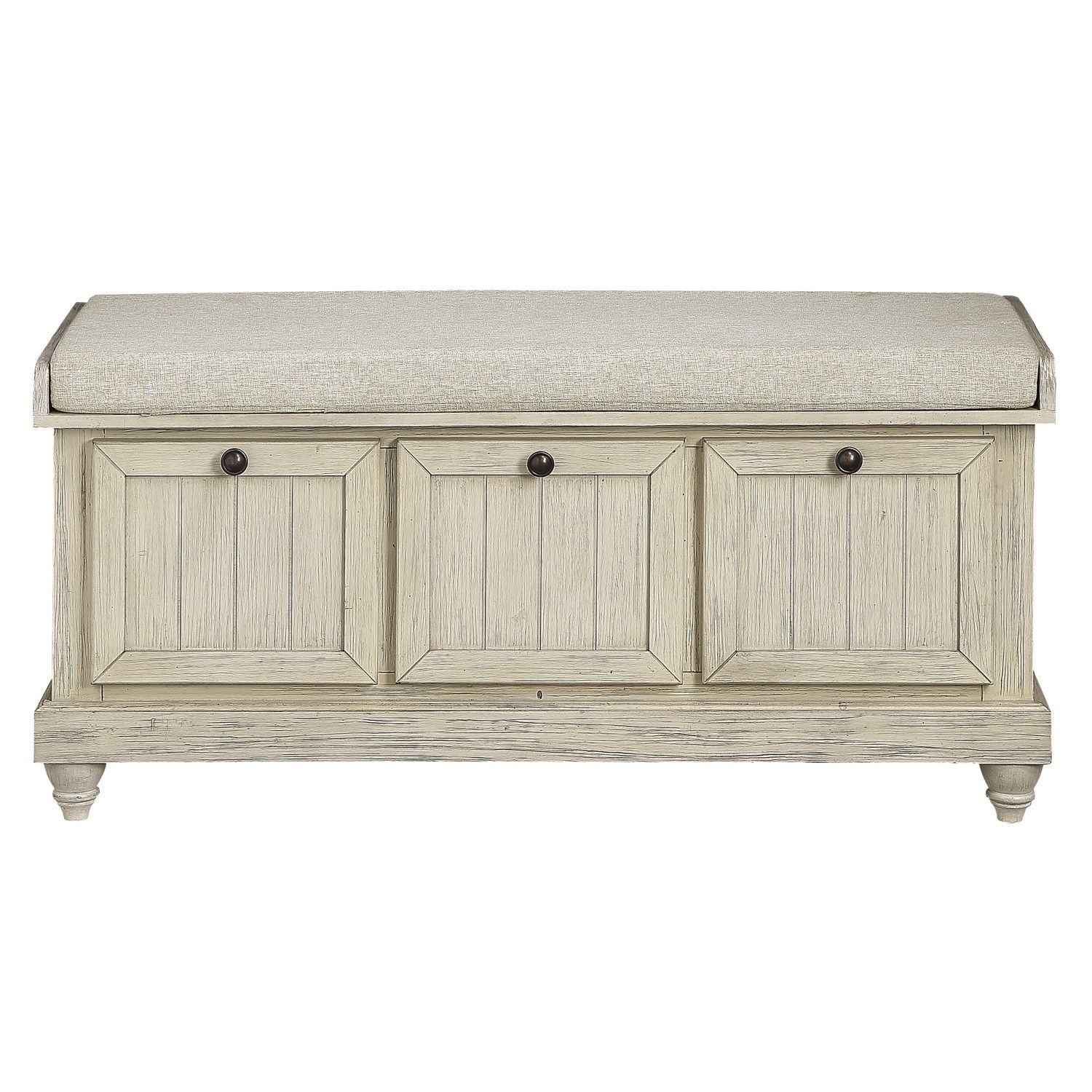 The Woodwell Collection will be a functional addition to your home. False drawer fronts serve as the base for this lift-top storage ottoman. A neutral tone beige padded seat provides a comfortable spot to sit as you prepare for your daily outings. Knob hardware creates a contrast to the antique white, with grey rub-through, finish.PRODUCT DIMENSIONS: Overall Dimension: 44" x 16" x 18"HSeat cushion: 42.5" x 15.25" x 2.25"Seat height: 18"Storage interior: 41.25" x 13.25" x 11"Listing Includes: One Bench Only.Simple Assembly Require.