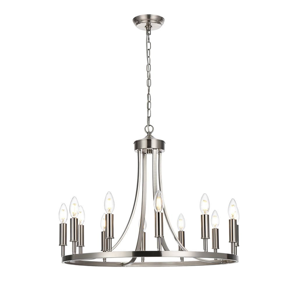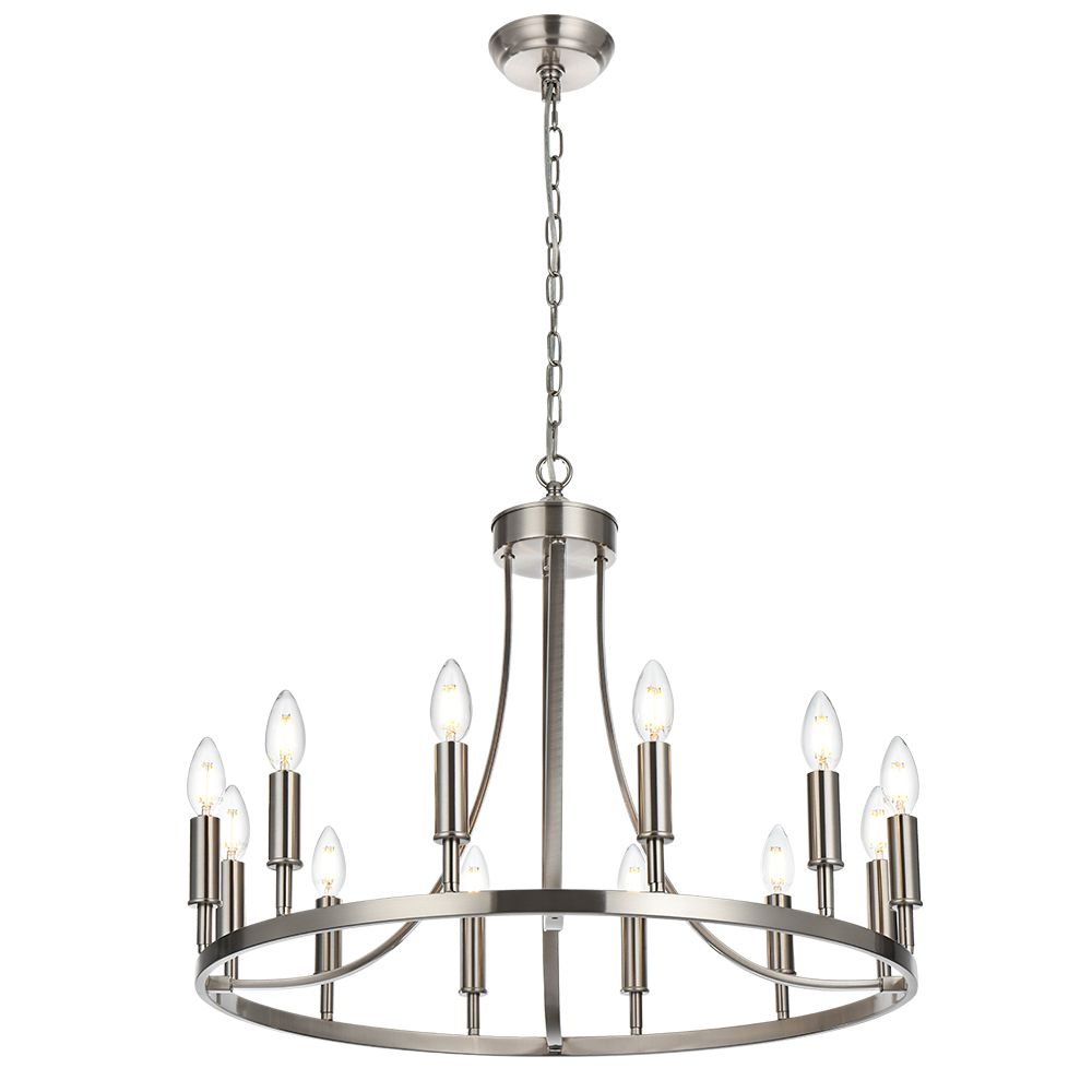 Designed with contemporary homes in mind, this chandelier is a stylish update to the silhouette of traditional chandeliers.farmhouse chandelier features a bold and innovative wagon wheel design. Round chandelier features linked rods that support the horizontally oriented exposed bulb open frame. Finely crafted and meticulously designed to creates a cozy home atmosphere.