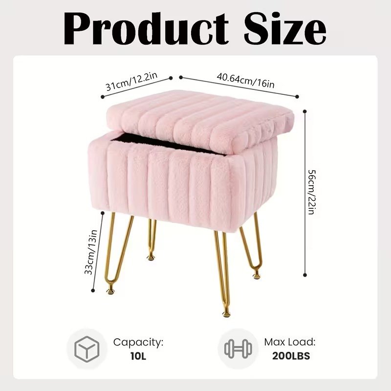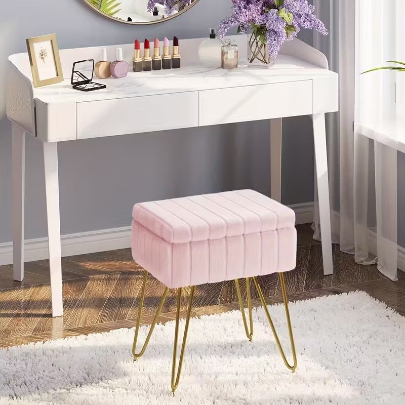This multifunctional vanity stool combines elegance, comfort, and storage in one compact design. Featuring a soft upholstered seat and 4 sturdy gold metal legs, this makeup chair doubles as a shoe-changing bench or storage ottoman. The hidden storage compartment provides ample space for cosmetics, skincare, or small accessories, helping you keep your space tidy and stylish. Perfect for bedrooms, living rooms, or studies, it also makes a thoughtful and practical home gift.