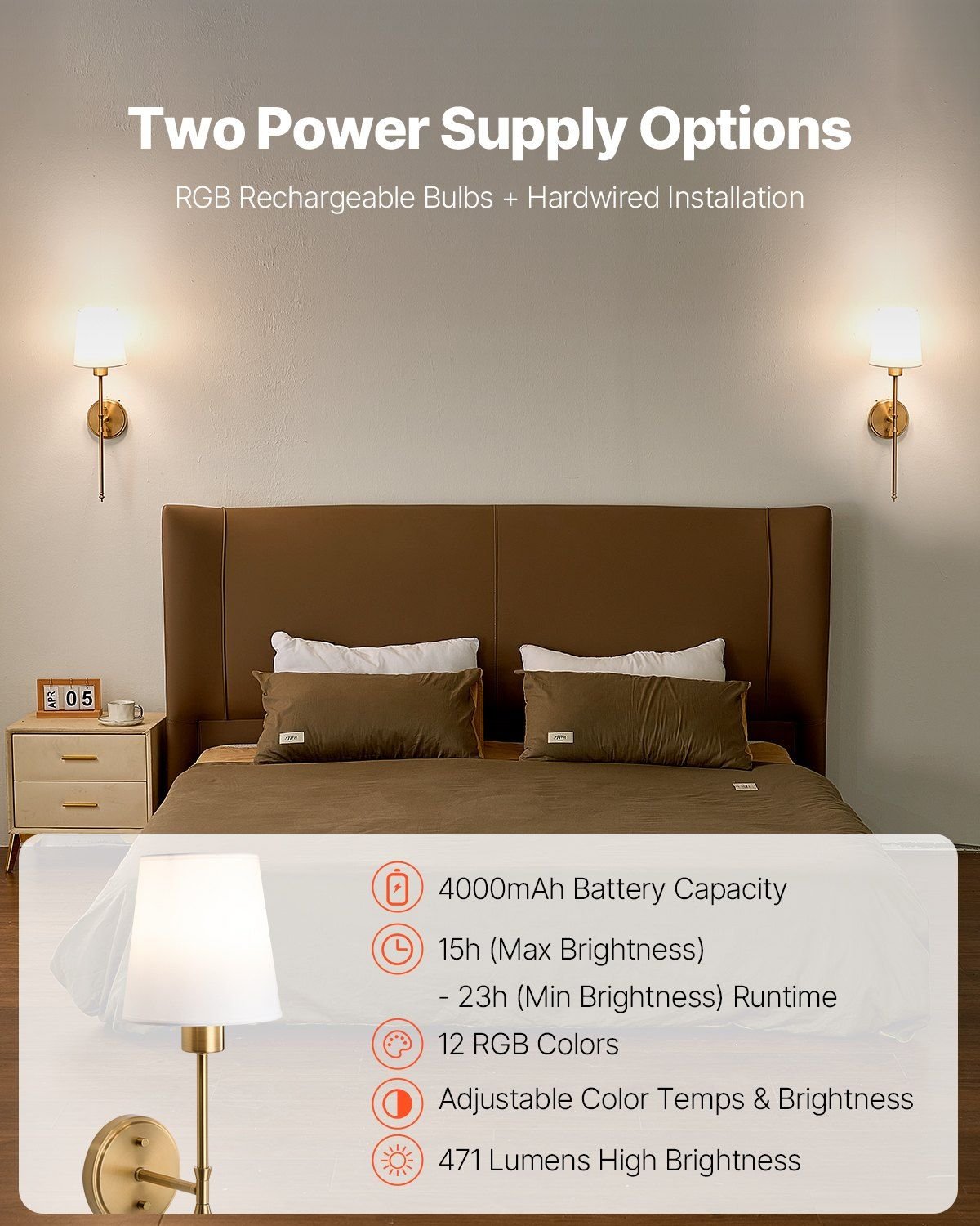1.Two Power Supply Options: This battery operated wall sconce set of 2 features 4000mAh large-capacity battery, 12 RGB colors, adjustable color temperature, brightness, and 471 lumens high brightness. It also supports hardwired installation (Note: this installation requires customer to purchase compatible bulbs separately, ≤60W).