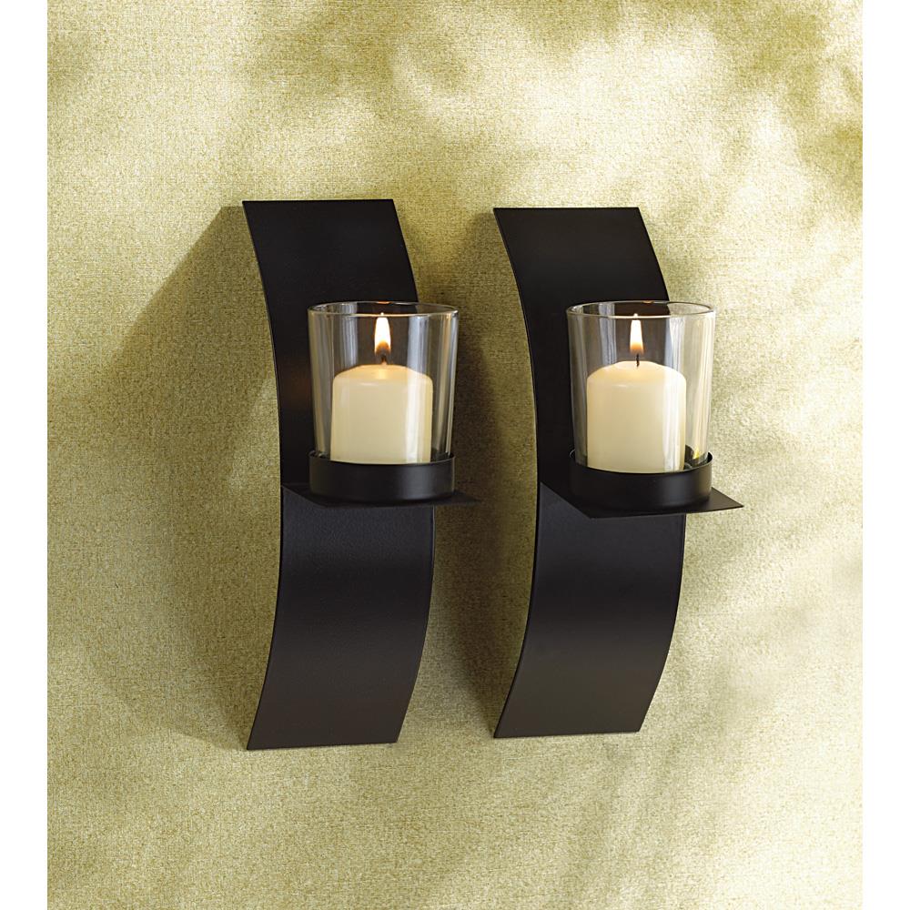 • With a matte black finish, curved metal wall plaques, and a clear glass votive cup this wall sconce adds a chic, modernistic look to any room.